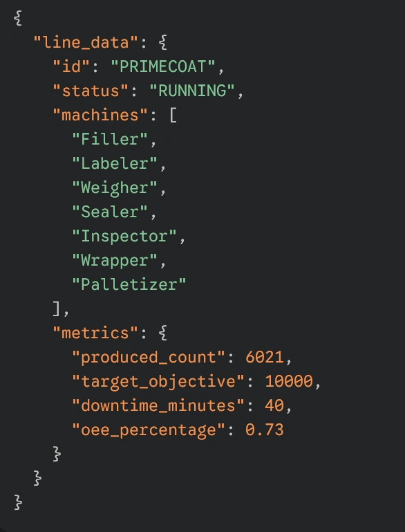 Several other Blueprints receive the parsed data from the Manager Blueprint and update the UI and objects in the scene like machine colors, production counts, active views and alert notifications.