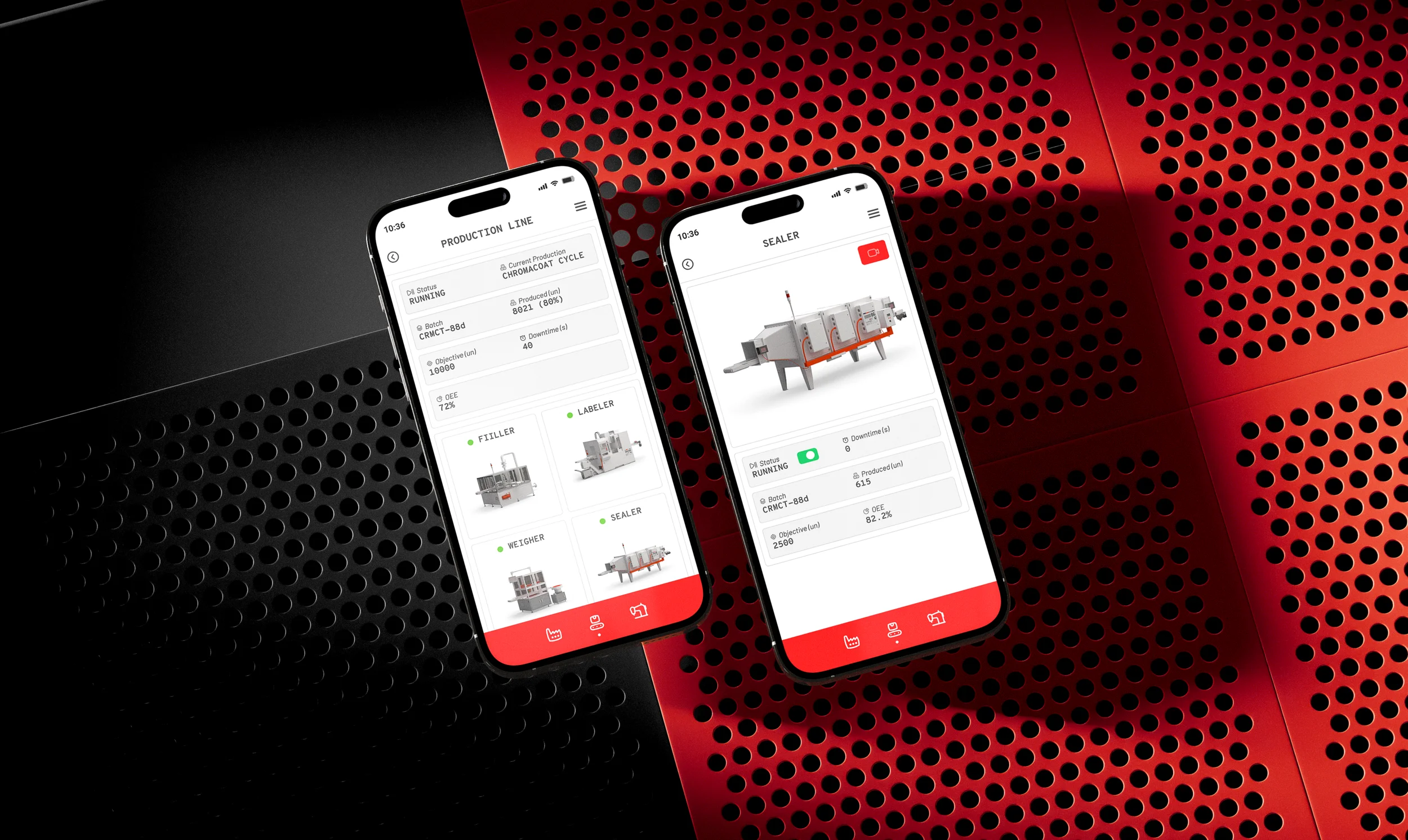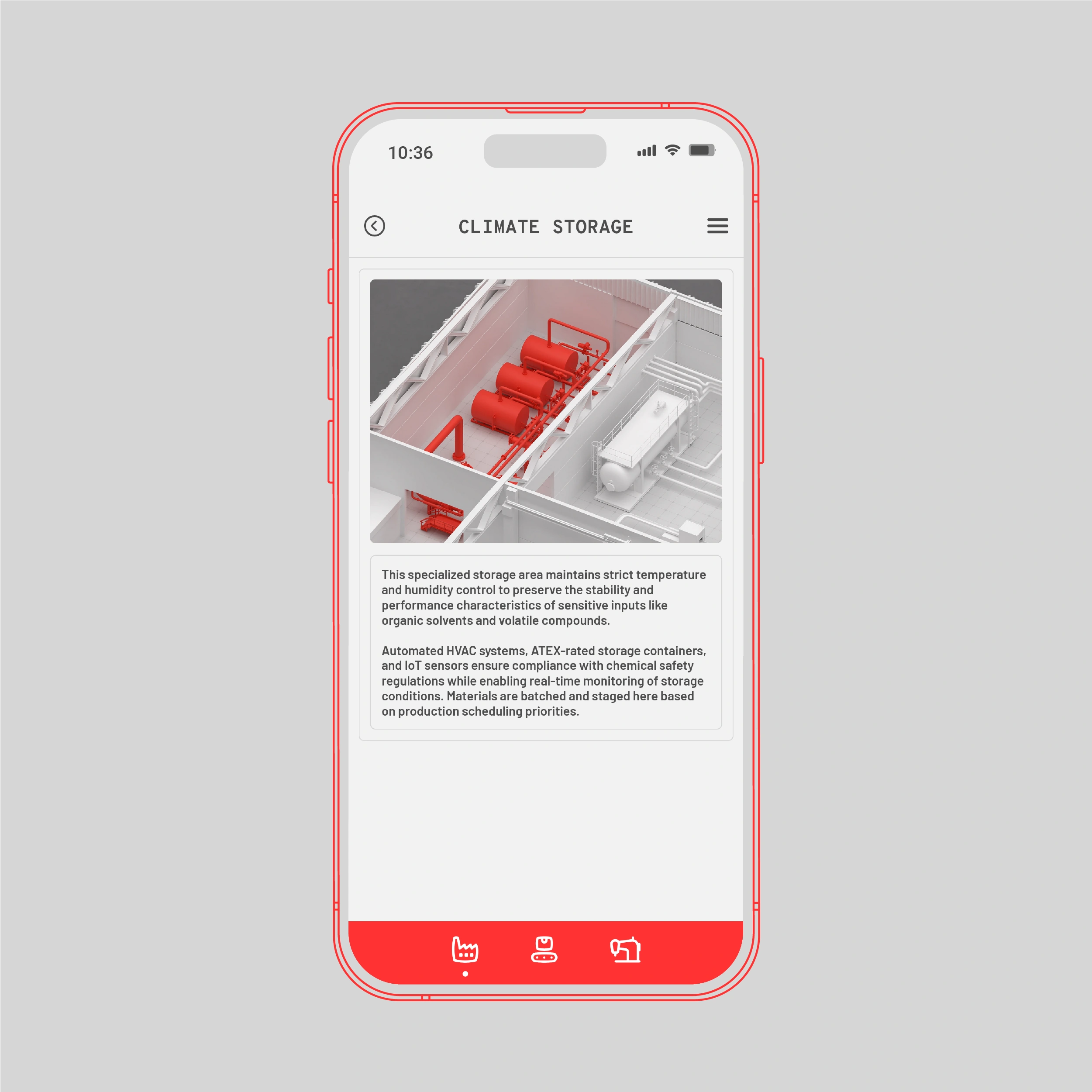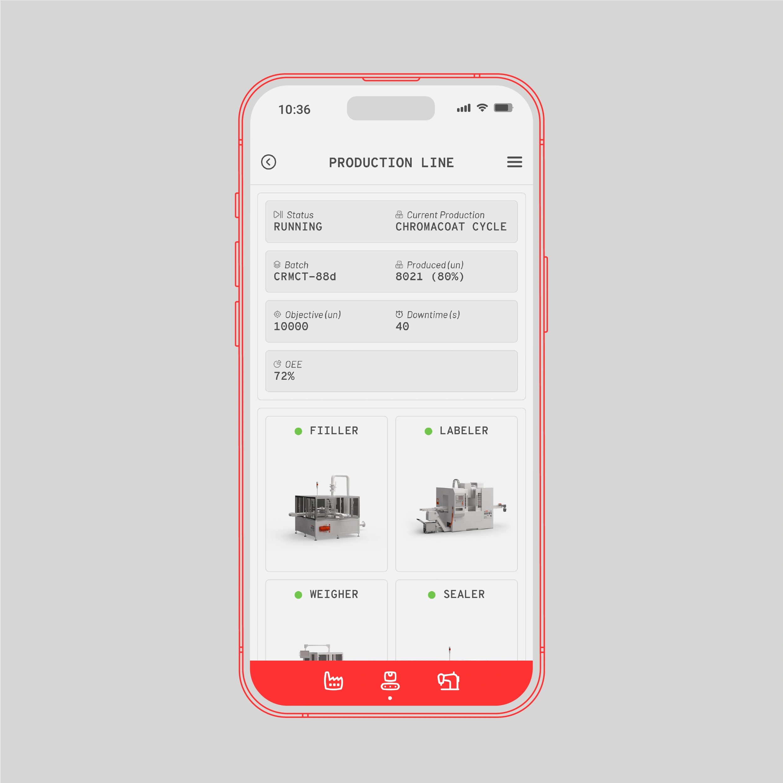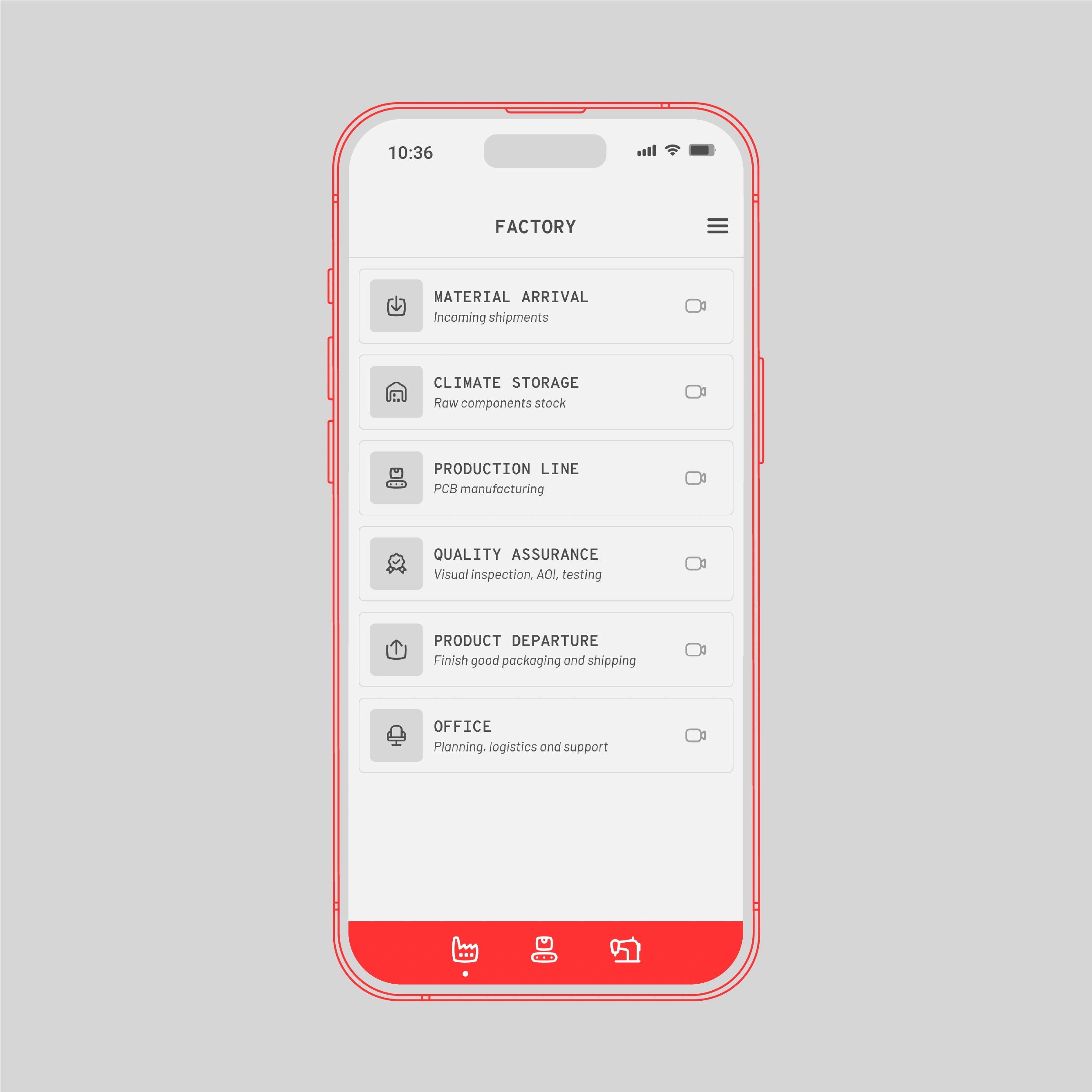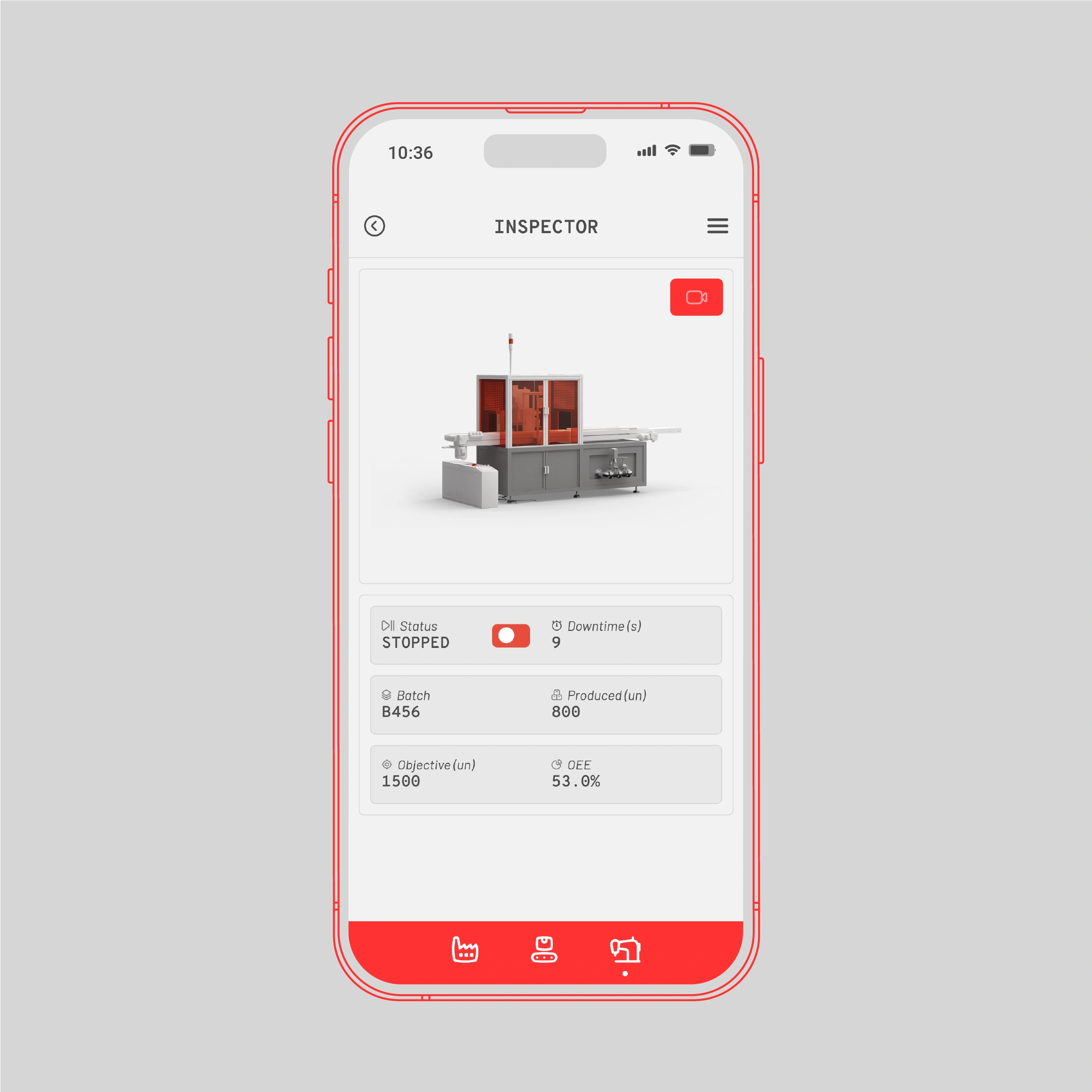 The mobile app is the remote control for the factory. It allows a quick overview of the factory’s operations, change factory settings and switch between camera views in the visualization.